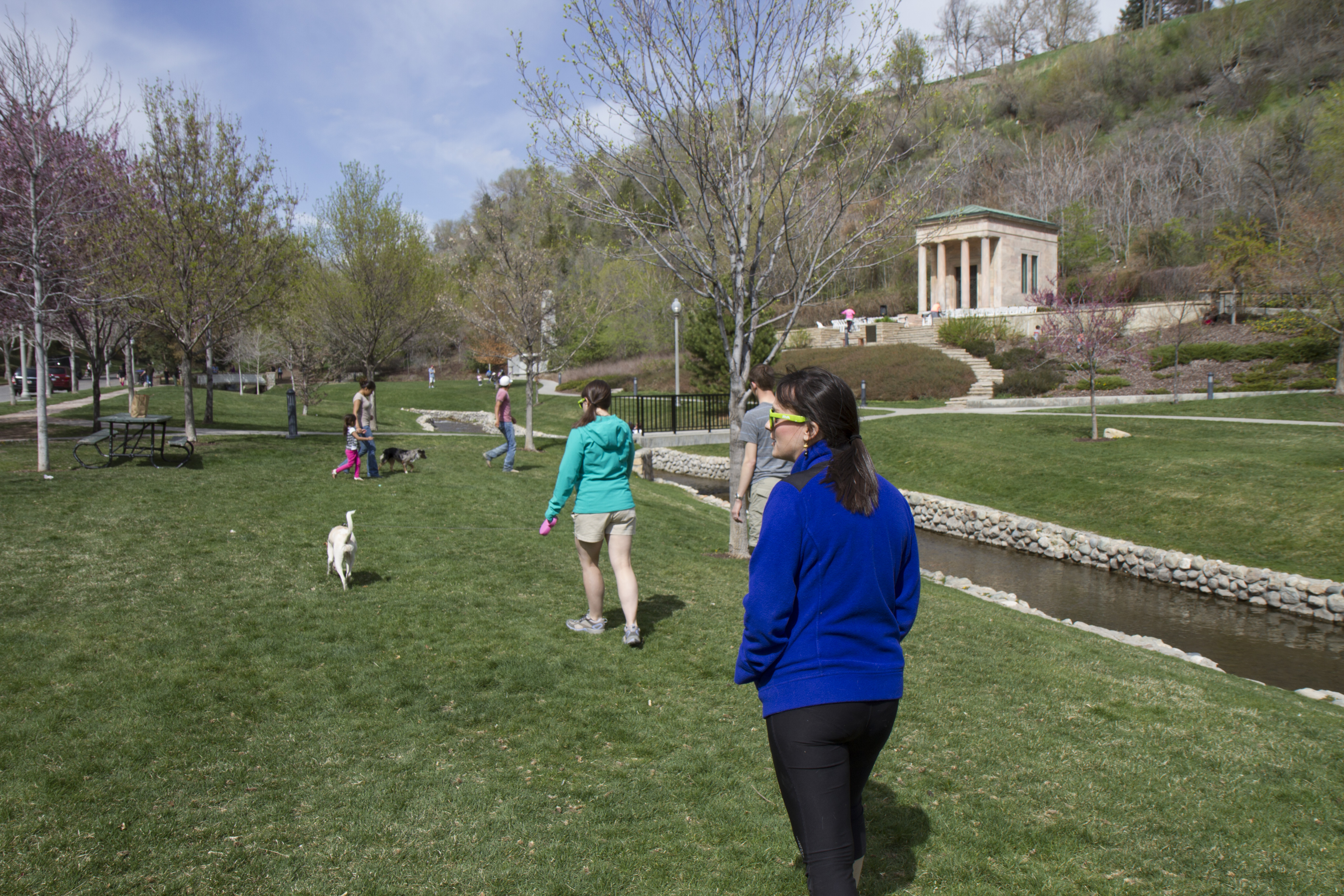 Right next to the Capitol Building is a set of stairs down into the canyon. Take that path and you end up in a doggie and human wonderland. I think the reason I love this area so much, is it reminds me of our home in Virginia. There are many little monuments and buildings that look historic and colonial, but all and all it is just a cute park that leads you up into City Creek Canyon.